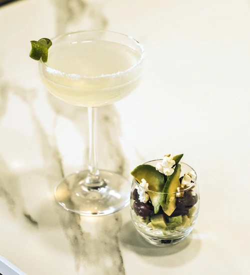 Food presentation: In a small verrine dish, put two tablespoon of ceviche then one teaspoon of the jelly, add salted pop-corns on the top.