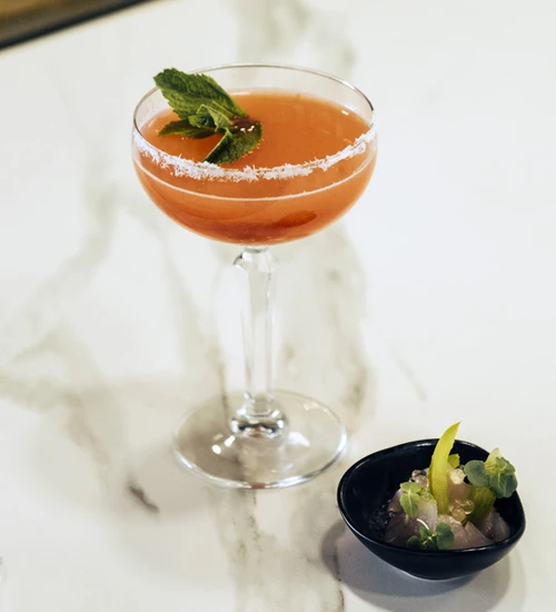 Food presentation : In a small verrine dish, place the seasoned tomatoes at the bottom. With the help of the tines of a fork, create some flakes on the strawberry margarita, to add on the top of the tomatoes. Delicately place the sea bream sashimi and add a bit of salt and pepper on the sashimi.
