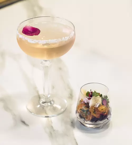 Food presentation : In a small verrine dish, start by placing the diced beetroot in the bottom, then add the diced salmon on top of it. Finish by adding a bit of chopped coriander and some shard of prawn crackers.