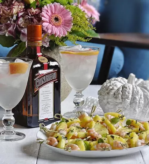 Marinate the shelled prawns in 5cl Cointreau, 5cl grapefruit juice and the fresh mint